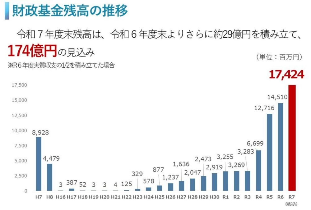 9月議会では令和6年度決算を提出しています。実質収支は58億円の黒字となり、財政基金は174億円になる見込みです。この「県の貯金」は、災害や有事の際に県民への支援策を迅速に行うために必須です。公約目標の200億円への歩みを着実に進めています。県財政は震災時の巨額借金返済の影響で厳しい状況が続く中、金利上昇や景気変動による税収減など急激な収支悪化への備えとしても一定の財政基金積立が不可欠です。