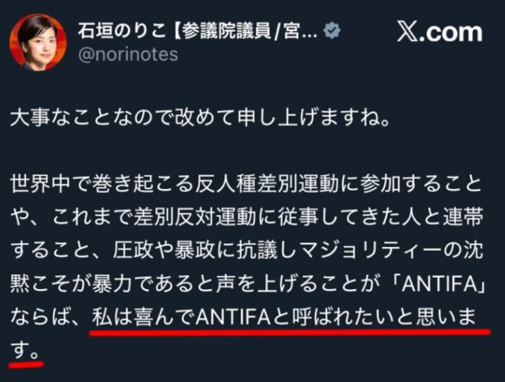 じゃあこれからは『”ANTIFA”立憲民主党・石垣のりこ』と呼ばせてもらうわ