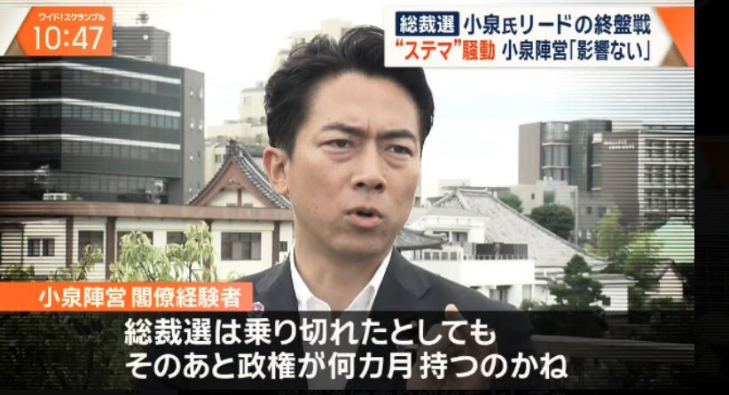 【進次郎は何か月持つのかね…】自民党総裁選、小泉進次郎陣営の閣僚経験者「(進次郎が)このまま行きそうだな。それにしても政策の打ち出しがないから、総裁選を乗り切れたとしても、そのあと政権が何か月持つのかね…」 pic.twitter.com/iBbwlRxYeM