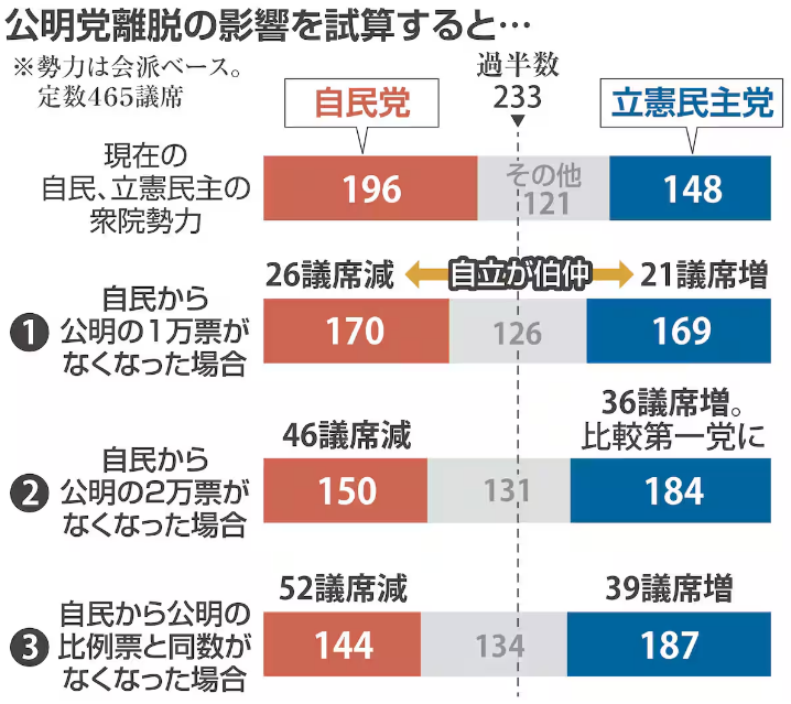 公明党の連立政権離脱を受け、産経新聞社が衆院選の自民党の獲得議席数への影響を試算したところ、自民は昨年10月の前回衆院選の小選挙区で勝利した132議席のうち約2割~約4割を失う可能性があることが分かった。東京など都市部を中心に自民敗退の公算が高まる結果だった。該当の小選挙区の次点は立憲民主党が多く、比較第一党の座を立民に奪われる可能性もある。