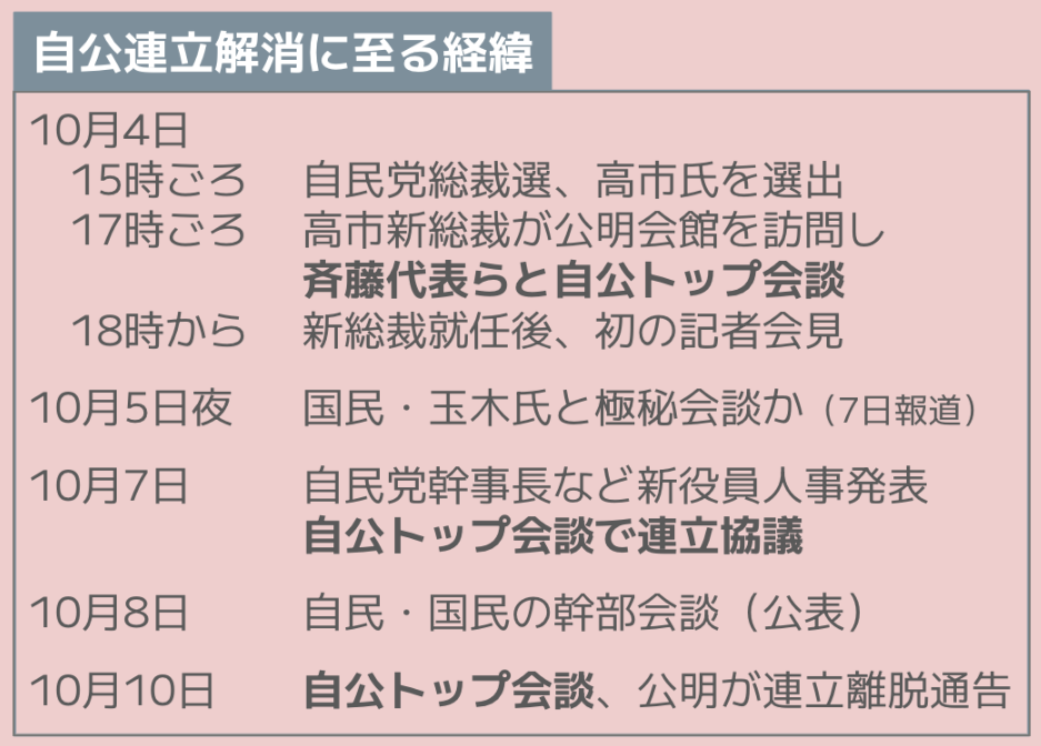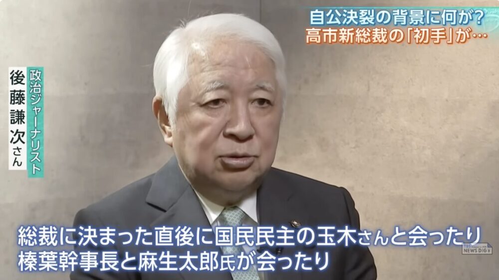 TBS「サンデーモーニング」は、公明党が自民党からの連立離脱を通告したことについて、10月12日の放送で取り上げ、共同通信出身の政治ジャーナリスト、後藤謙次氏のコメントを放送した。この中で、後藤氏は、高市氏が決まった直後に国民民主党の玉木雄一郎代表と会ったことなどを挙げ、「公明党を完全にないがしろにした」ことが間違いだったと指摘した。