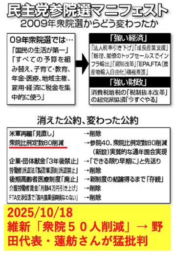 ネットでは、民主党時代に、「衆院議員定数80削減」を訴え、衆院選マニフェストにも記されていたとの指摘が相次いでいる。