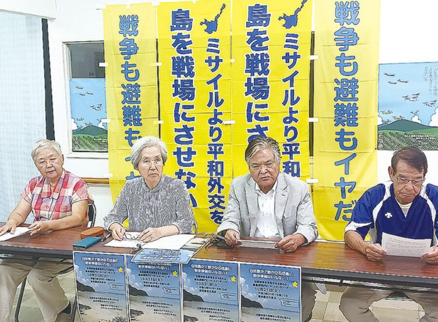 石垣島の平和と自然を守る市民連絡会(上原秀政、白玉敬子共同代表)の役員らが14日、市内の事務所で記者会見し、20日から全国各地で始まる自衛隊統合演習の中止を求める声明を出した。