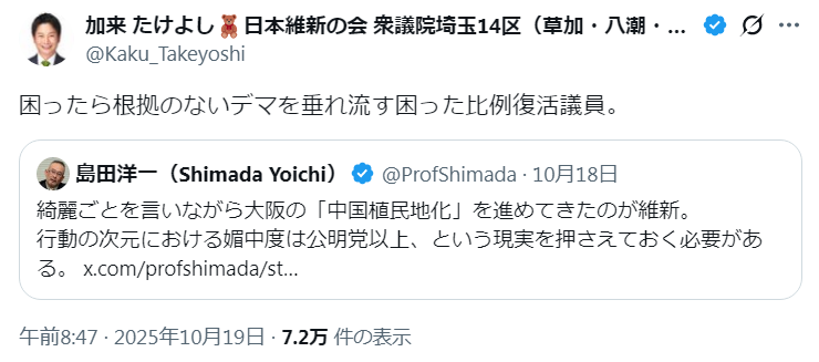 行動の次元における媚中度は公明党以上、という現実を押さえておく必要がある。 https://t.co/pNqWGqS7KR— 島田洋一(Shimada Yoichi) (@ProfShimada) October 17, 2025