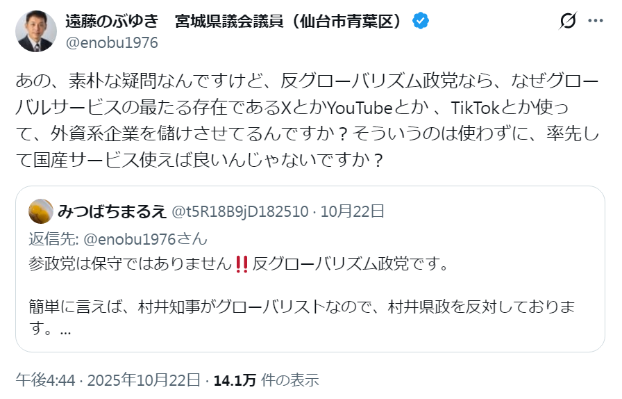 ¥399 (2025年10月25日 22:39 GMT +09:00 時点 - 詳細はこちら価格および発送可能時期は表示された日付/時刻の時点のものであり、変更される場合があります。本商品の購入においては、購入の時点で当該の Amazon サイトに表示されている価格および発送可能時期の情報が適用されます。)遠藤のぶゆき・宮城県議会議員(公明党)、グローバリズムの意味をわかっていないもよう… 「(参政党が)反グローバリズム政党なら、なぜグローバルサービスのXとかYouTubeとかTikTokとか使ってるんですか?」