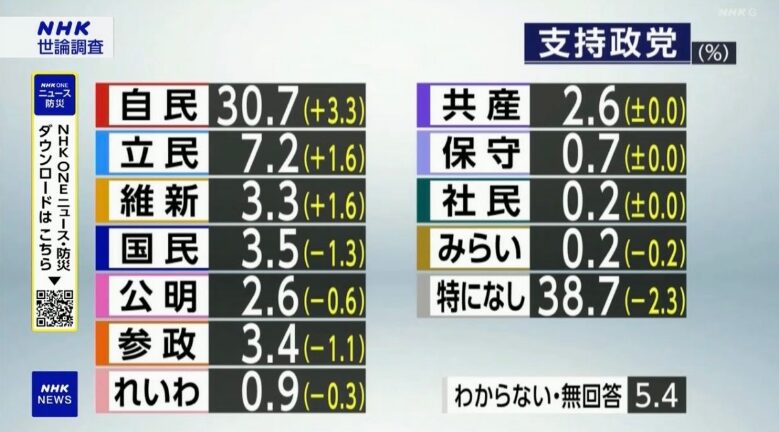 <NHK世論調査> 政党支持率 自民党30.7%(+3.3)、立憲民主党7.7%(+1.6)、国民民主党3.5%(-1.3)、参政党3.4%(-1.1)…