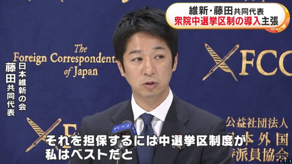日本維新の会の藤田共同代表が、衆議院選挙について「中選挙区制度」に移行するべきだとの考えを示しました。