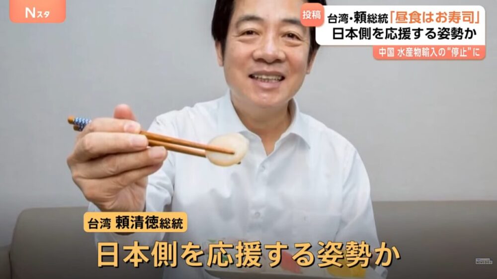 中国政府が日本産の水産物の輸入を事実上停止する措置をとる中、「昼食はお寿司」と、台湾の頼清徳総統が北海道産のホタテを箸であげる写真をSNSに投稿しました。