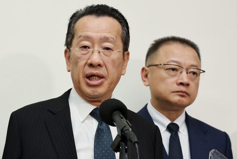 メディアの取材に応じる顧立雄国防部長(左)=11月19日、台北市