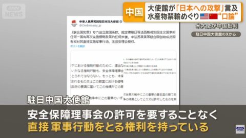 日中の緊張が高まるなか21日、日本にある中国大使館は国連安保理の許可なく、中国は日本を攻撃できる権利があるとSNSで投稿しました。