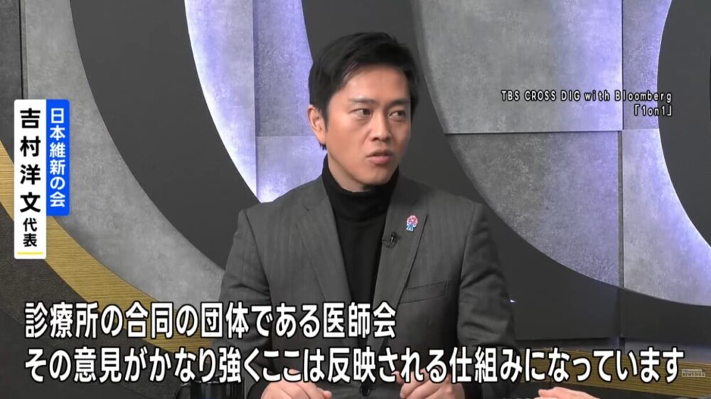 日本維新の会の吉村代表はTBSのユーチューブチャンネルで、診療報酬を決定する中医協のメンバーについて、その多くを占める日本医師会の関係者を交代させる必要性を訴えました。