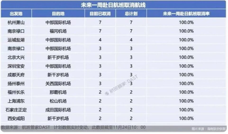 中国メディアが掲載した日中間の路線の欠航リスト。運航していない路線が含まれる【画像】