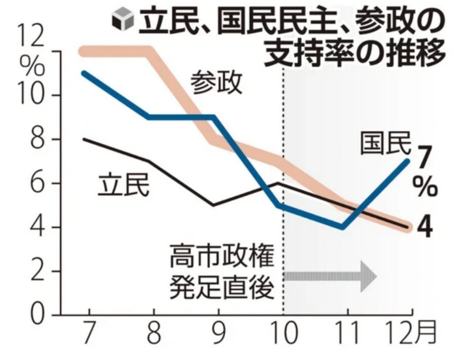 一方、国民民主も7月の11%から低落傾向だったが、今回調査では持ち直した。18日に行われた玉木代表と高市首相の会談で、所得税の非課税枠「年収の壁」を国民民主の要望に沿う形で178万円まで引き上げると決めたことが好感されたとみられる。党幹部は「一喜一憂しても仕方ない。地道にやるだけだ」と気を引き締めた。
