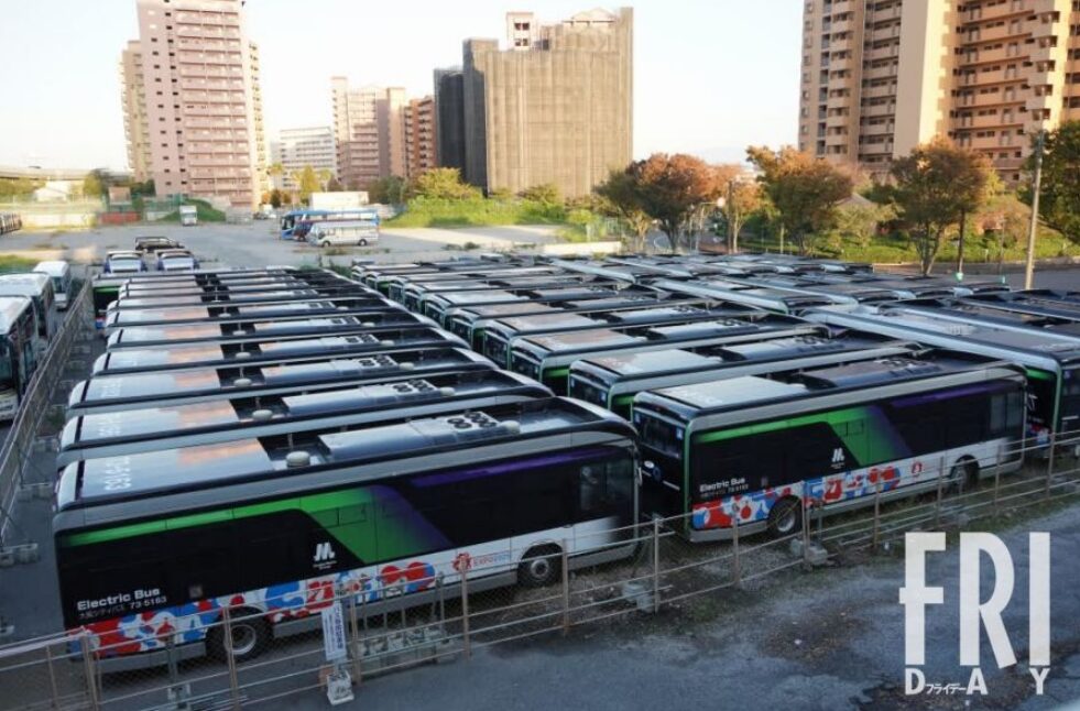 そう話すのは、大阪メトロのファンサイト『Osaka-Subway.com』を管理する運営者の男性だ。大阪府泉大津市内にある巨大なスペースに突如出現した万博カラーのEVバス。12月中旬には50台近くが止められていたが、これらは不具合多発で問題になっている『EVモーターズ・ジャパン(以下、EVMJ)』が中国より輸入・販売した『WISDOM大型(全長10.5m)』である。10月に閉幕した『大阪・関西万博』では、主に桜島シャトルバスと舞洲パークアンドライドバスなどに使用された。