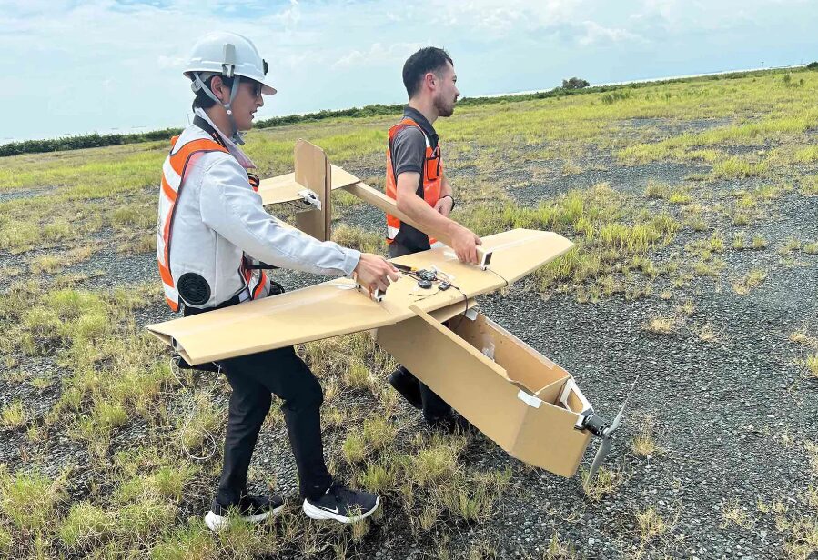 愛知県名古屋市の近郊。バイク用ヘルメットをかぶった山口拓海氏は、手にした横幅約1.8メートルの飛行機型段ボール製ドローンを勢いをつけて空中に投じた。ドローンは直後に落下した。