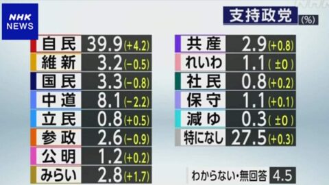 一方、参院選で公明党に投票した人のうち73・9%が衆院選で中道に投票した。中道を結党した立憲と公明で支持層固めに差が出た。