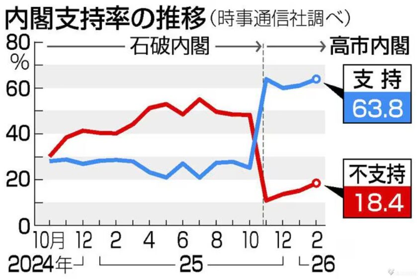 時事通信社の2月世論調査によると、高市早苗内閣の支持率は63.8%(前月比2.8ポイント増)、自民党の支持率は30.1%(同7.6ポイント増)。政権の安定度を示す内閣と党の支持率を合わせた数値は93.9%で、安倍晋三総裁下で自民党が政権を奪還した2012年12月以降、最高を記録した。8日投開票の衆院選で、自民党を戦後最多の316議席を得る大勝に導いた高市首相の政権は、国民の支持という点でも、歴代最強と言える。(時事通信解説委員長・高橋正光)