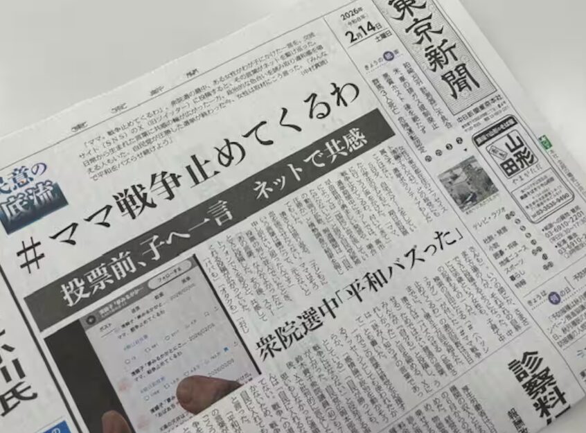 衆院選終盤、SNSを通じて話題になった政治的なハッシュタグ「#ママ戦争止めてくるわ」。東京新聞は投開票後の2月14日付け1面トップで大きく取り上げ、「平和バズった」「ネットで共感」などの見出しを付けてうれしそうだった。