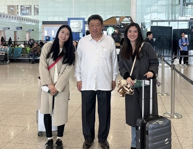 日本政府手配のチャーター機でサウジアラビアから東京に到着した2人の台湾人(左右)。中央は駐サウジアラビア代表(大使に相当)の張治平さん(外交部提供)