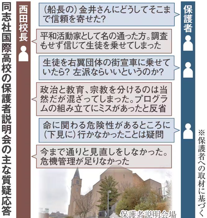 同志社国際高の女子生徒ら2人が死亡した事故を巡り開かれた同校の保護者説明会では、学校側が船長に出航判断を一任し、教員も引率しないなど不十分な安全対策への批判が噴出した。