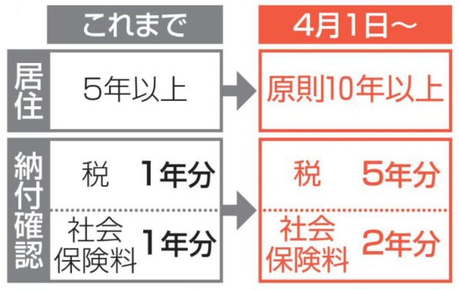 法務省によると、4月1日以降は融和性の観点から、居住期間を「原則10年以上」とする。現在は直近1年分の税と社会保険料の納付を確認する運用を、それぞれ5年分と2年分に改める。4月1日以前の申請者にも適用する。