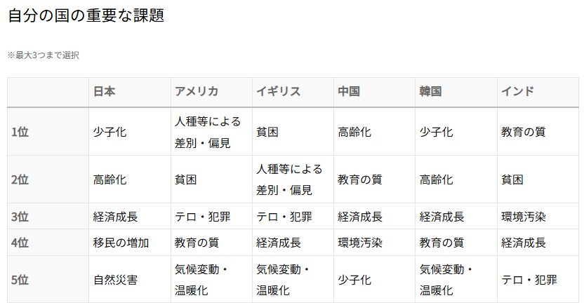 「自分の国の重要な課題(3つまで)」では、世界でも有数の少子化水準にある日韓両国が、前回2024年2月の第62回調査と同様、「少子化」、「高齢化」が1、2位。日本では前回12位だった「移民の増加」が約20%と3倍に増え、全体の4位に跳ね上がっています。