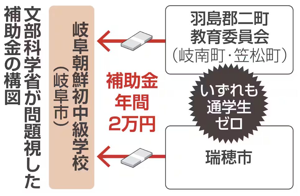 2町で構成する羽島郡二町教育委員会によると、岐阜朝鮮初中級学校に対し、少なくとも令和元年度から7年度まで両町から1万円ずつ、計2万円を交付。この間、両町内から通学する児童生徒はいなかった。昨年に文科省が指導した後もとりやめず、2町はそれぞれ令和8年度当初予算に補助金を計上した。