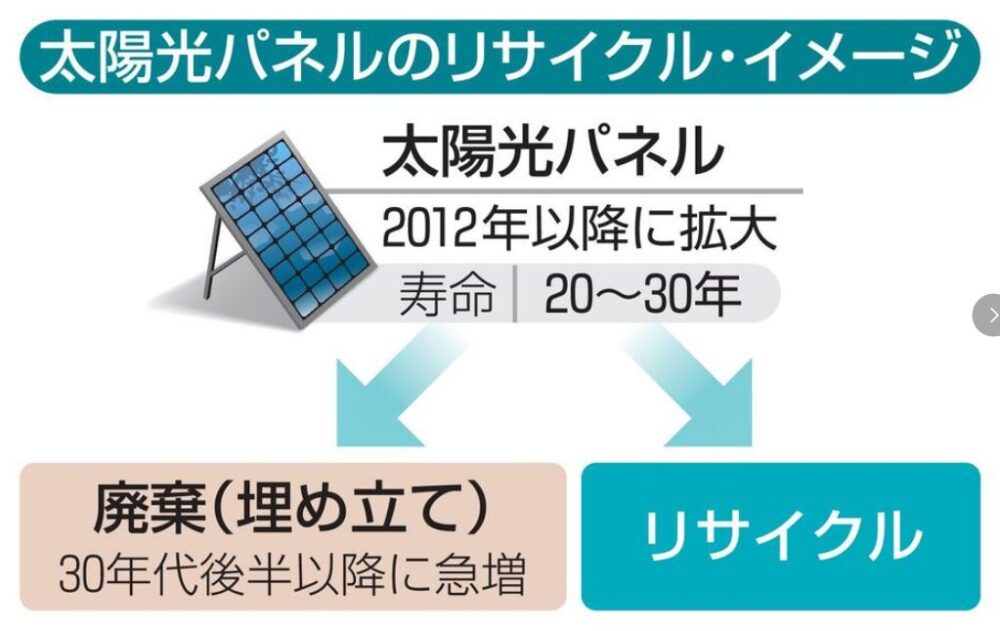 太陽光パネルの寿命は20~30年とされる。廃棄量は30年代後半以降に急増し、40年代前半にピークを迎え、年間で最大50万トンに上る見通し。政府は当初、リサイクルを義務付ける法案の国会提出を検討し、製造業者と輸入業者が費用を負担する内容だった。