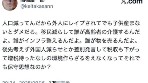 高橋慶一郎さん「人口減ってんだから外人にレイプされてでも子供生まないとダメだろ」