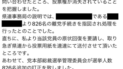 支持者826人が党員抹消された中山展宏前衆議院議員「県連事務局の説明では、〇〇〇〇である〇〇〇〇より826名の離党手続きを指示され処理を行ったとのことでした」